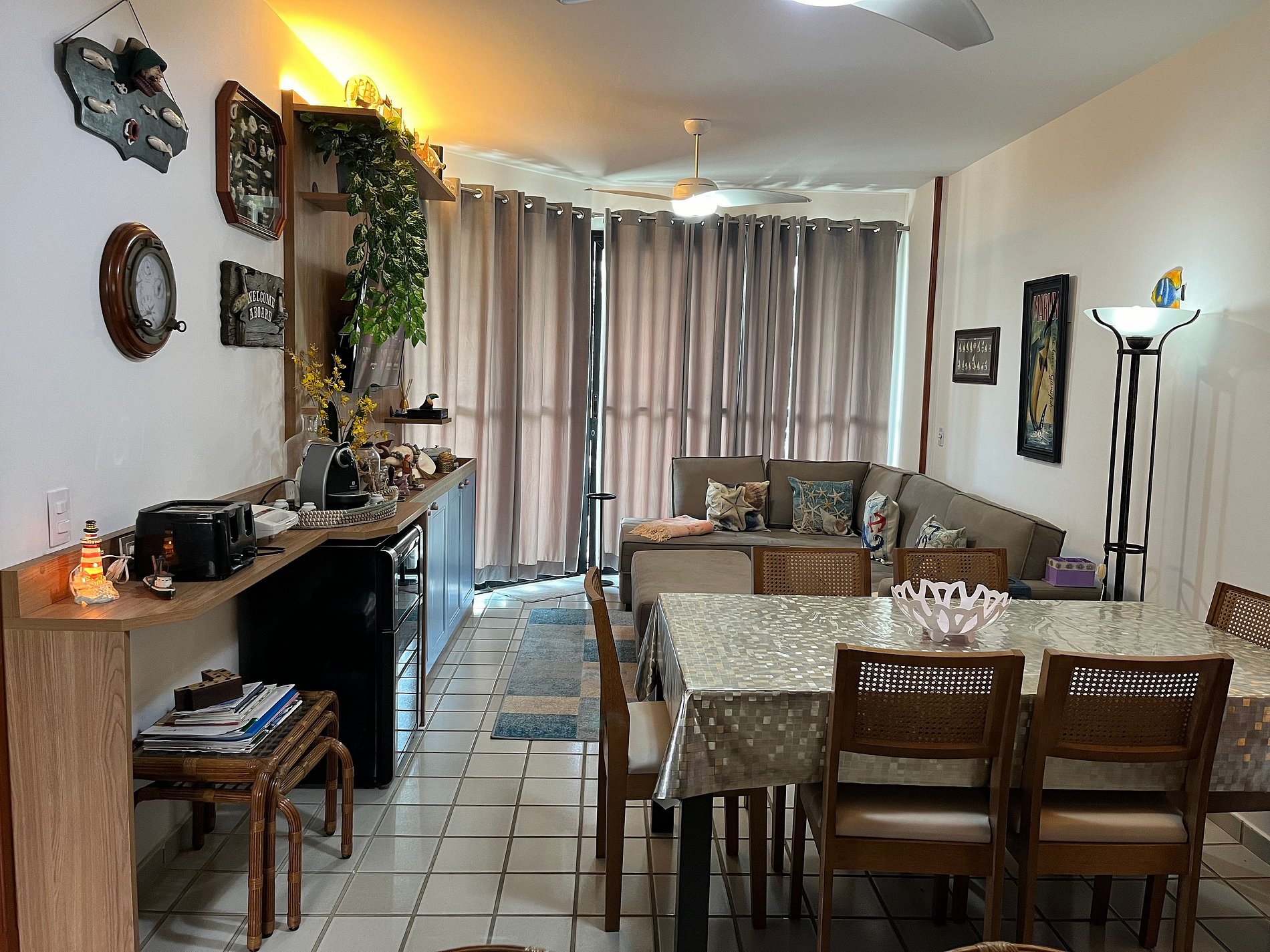 Lovely apartment on the beachfront, 4 bedrooms, 3 of which are social (1 suite) and 1 service bedroom, 3 bathrooms, normal/maximum capacity of up to 8/10 guests, silent and efficient ceiling fans/exhaust fans in all environments, huge balcony with views of the sea, mountains and Atlantic Forest, protective screens on the windows and balcony, 2 parking spaces, close to shopping, restaurants, snack bars, shops and main attractions of RIVIERA (you can walk without taking the car out of the garage).