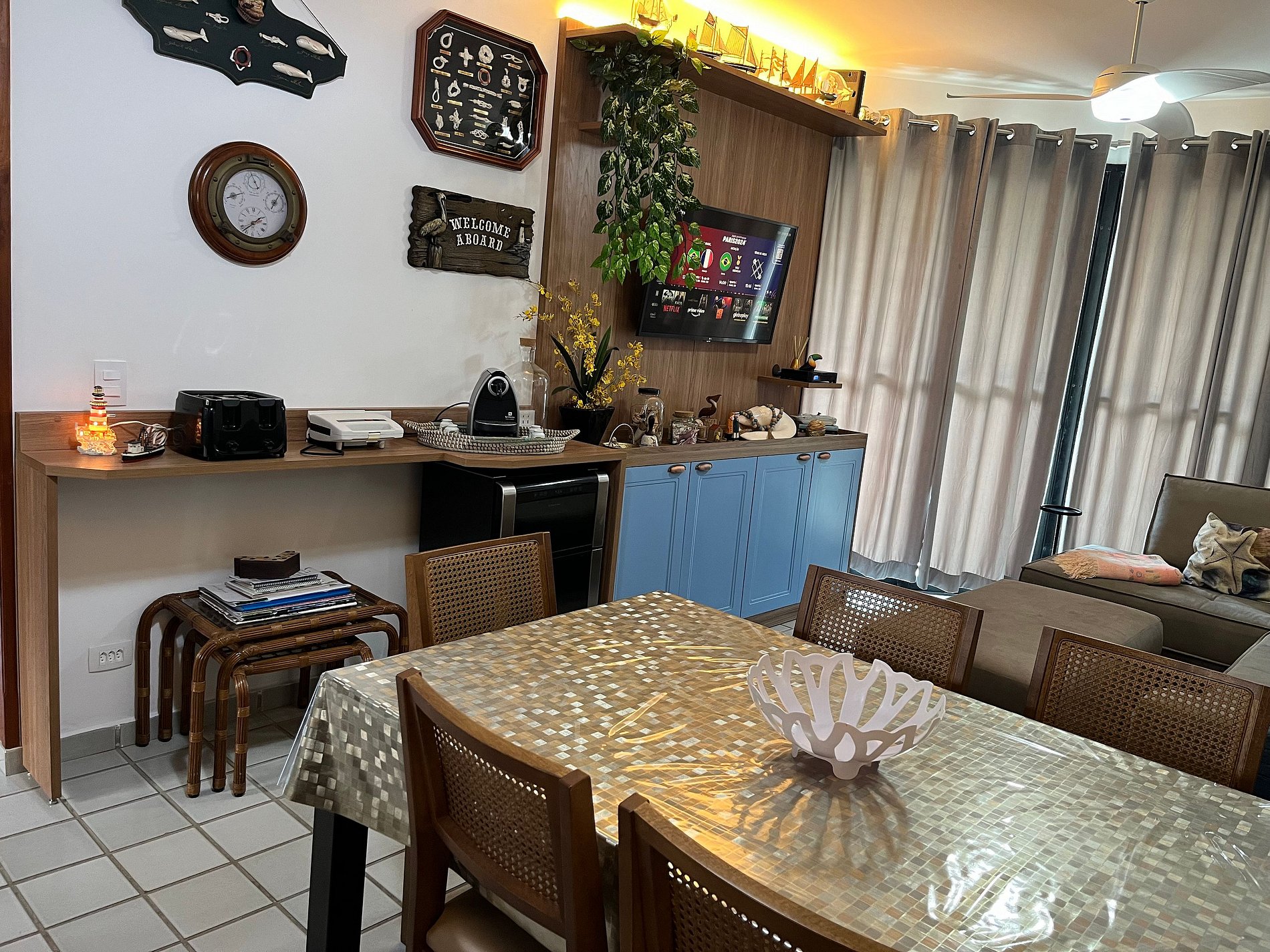 Lovely apartment on the beachfront, 4 bedrooms, 3 of which are social (1 suite) and 1 service bedroom, 3 bathrooms, normal/maximum capacity of up to 8/10 guests, silent and efficient ceiling fans/exhaust fans in all environments, huge balcony with views of the sea, mountains and Atlantic Forest, protective screens on the windows and balcony, 2 parking spaces, close to shopping, restaurants, snack bars, shops and main attractions of RIVIERA (you can walk without taking the car out of the garage).