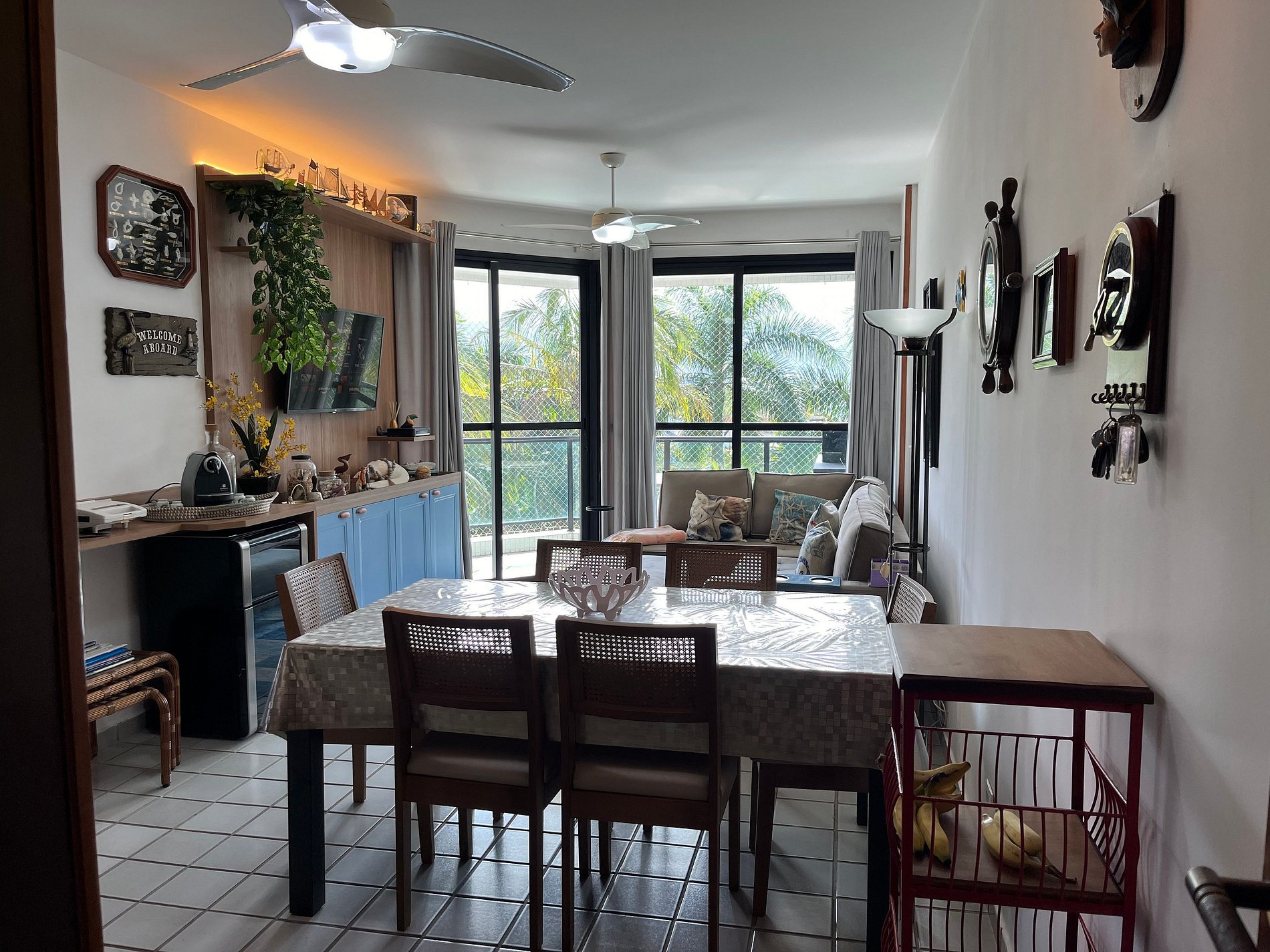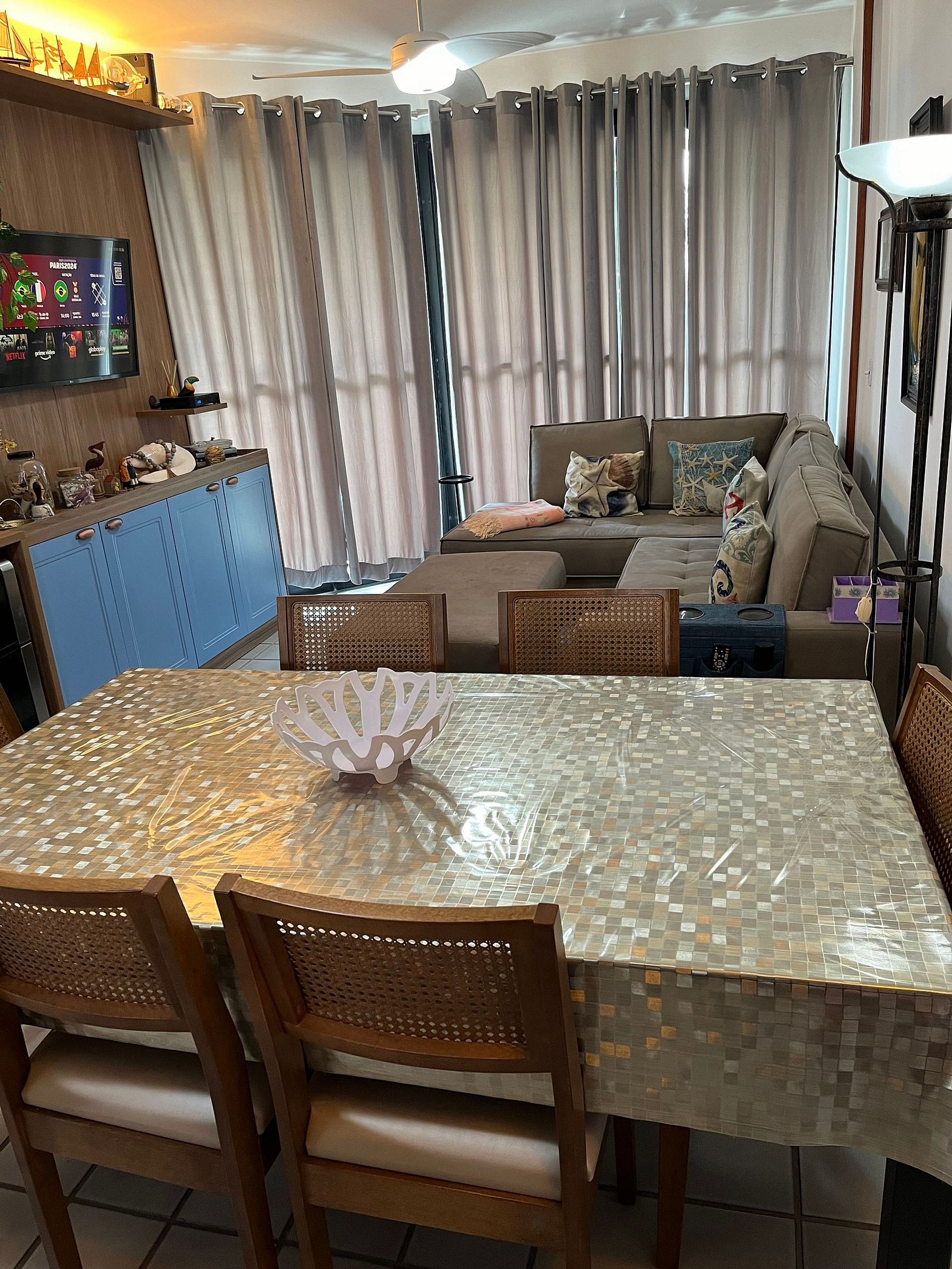 Precioso apartamento en primera línea de playa, con 4 habitaciones, 3 de las cuales son sociales (1 suite) y 1 habitación de servicio, 3 baños, capacidad normal/máxima de hasta 8/10 huéspedes, ventiladores de techo/extractores silenciosos en todos los ambientes. , enorme balcón con vista al mar y Mata Atlántica, mamparas protectoras en ventanas y balcón, 2 estacionamientos, cerca de tiendas, restaurantes y principales atracciones de RIVIERA (puedes caminar sin tomar el coche fuera del garaje).