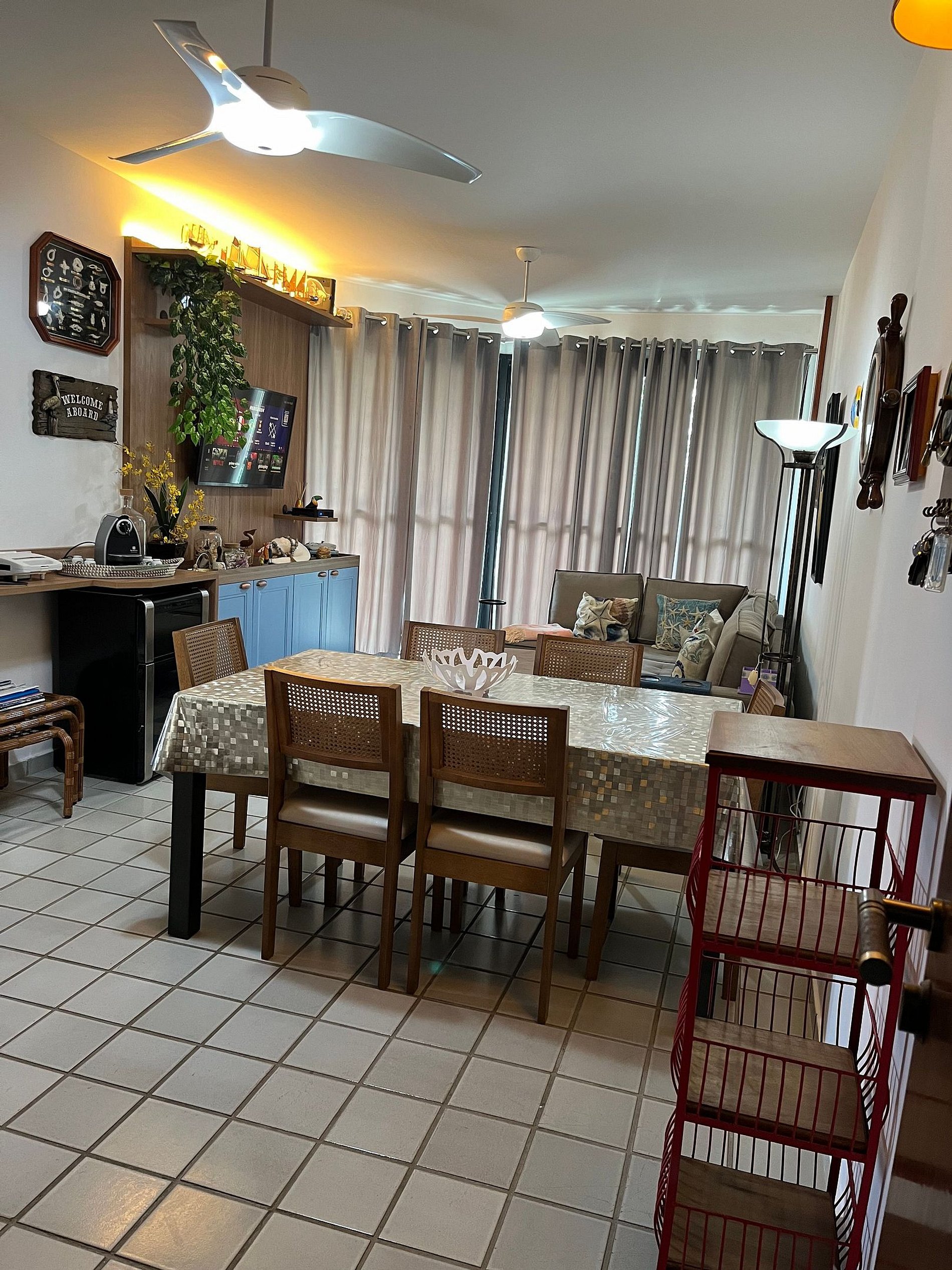 • Como este aptº é utilizado também pela família ou parentes do(s) proprietário(s), alguns armários estão trancados com chaves, cadeados ou presos com enforca-gato e não devem ser abertos pois tem objetos e utensílios de uso exclusivo do(s) proprietário(s). Em cada ambiente tem outros armários com cabides ou cômodas disponíveis para os hóspedes acomodarem seus objetos pessoais durante sua estadia.
